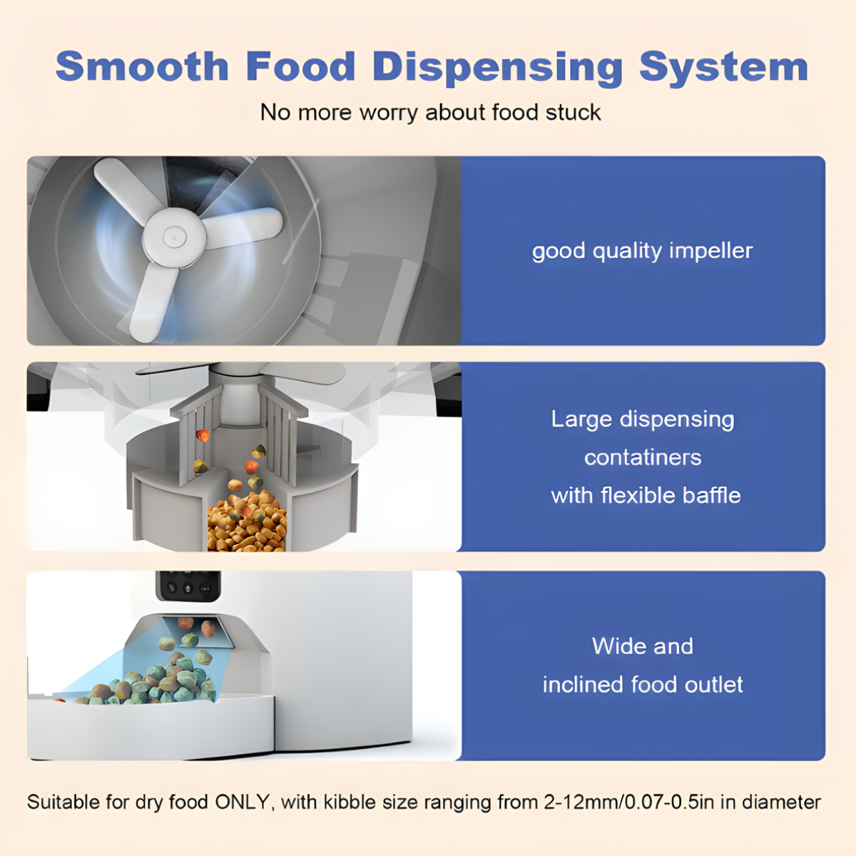 Our feeder uses a food swinging system and smooth distribution design to keep food flowing evenly into the bowl — no more shaking the feeder to get kibble out.