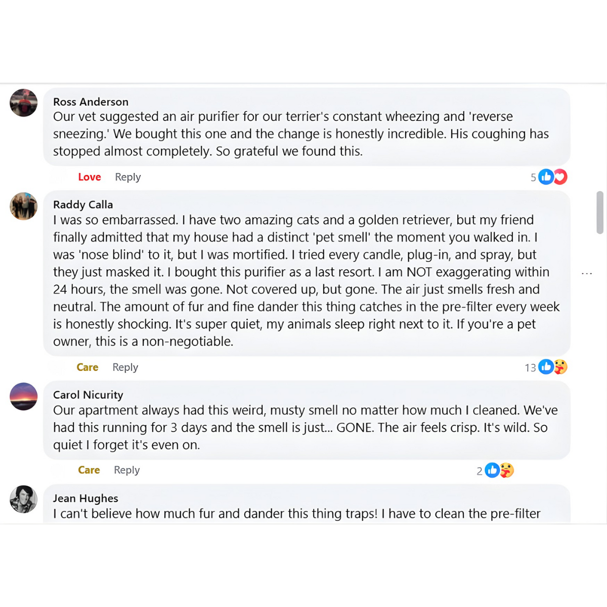 We have two cats and a dog in a small apartment. I'm clean, but there was always a lingering 'pet smell,' especially from the litter box area. We bought this specifically for the Activated Carbon filter, and it's a game-changer. Within an hour of turning it on, the living room smelled like... nothing! Just fresh, clean air. It's a must-have for any pet owner.